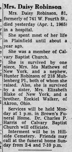 Obituary for Mrs. Daisy Robinson, The Courier News, April 2, 1965, page 10.