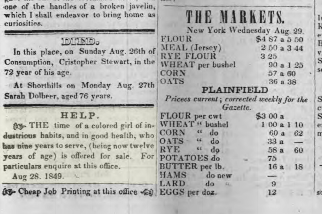 On August 30,1849, page 3, the Plainfield Gazette advertised a twelve-year-old girl for sale, listed casually beside the latest prices for flour and potatoes. Her fate is unknown.