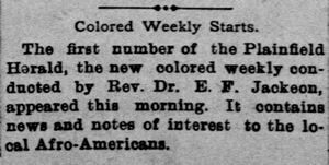 In 1873, Rev. John D. Bagwell, pastor of Mount Olive Baptist Church. started the first Black newspaper in Plainfield, the New Jersey State Republican. Later, Rev. Dr. E. E. Jackson, also of Mount Olive, published the Plainfield Herald. Learn more about these early newspapers here.