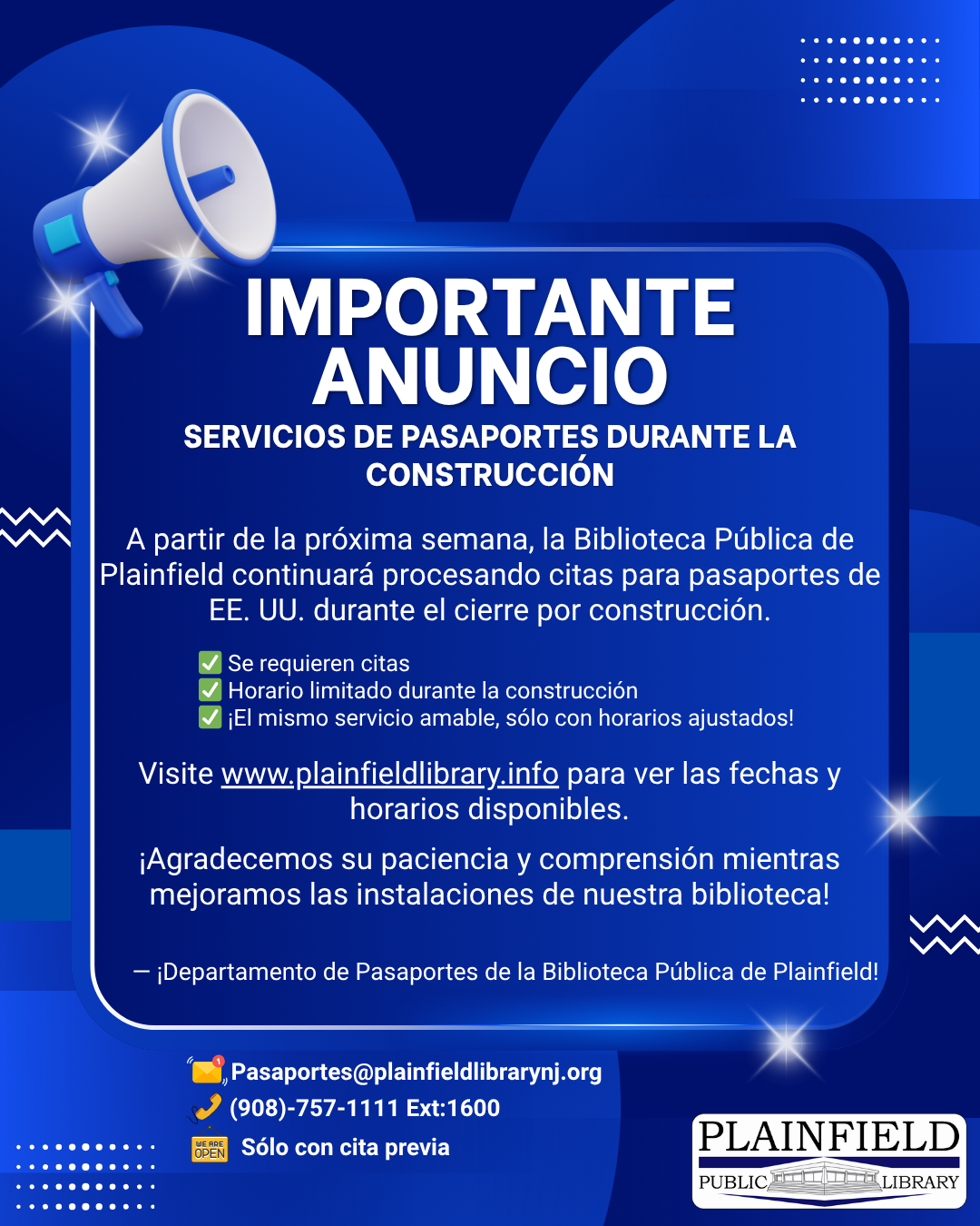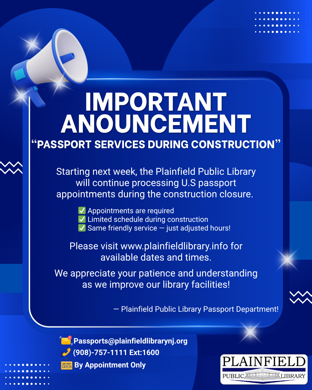 Passport services are offered by APPOINTMENT ONLY. No walk-in services.
