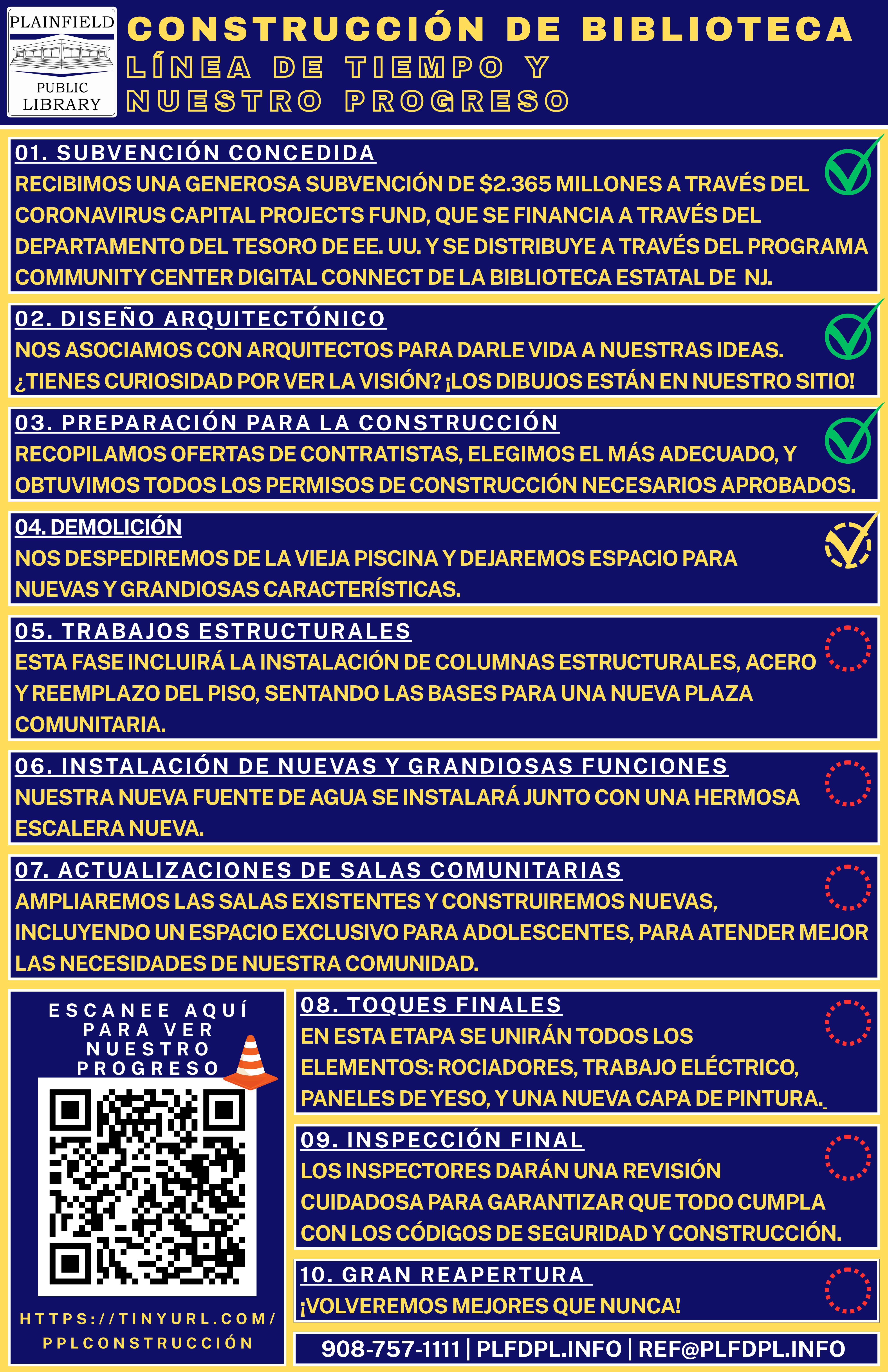 Below is our projected Construction Timeline! We are currently at step 4 and nearly done with the demolition of the fountain. We are working on removing debris from the building and getting ready for the next phase. The library closure has been extended for one more week. We will tentatively open on July 28th.